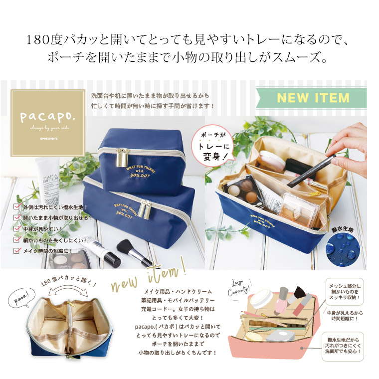 pacapo.(パカポ)は180度パカッと開いてとっても見やすいトレーになるので、ポーチを開いたままで小物の取り出しがらくちんです! メッシュ部分に細かいものをスッキリ収納。