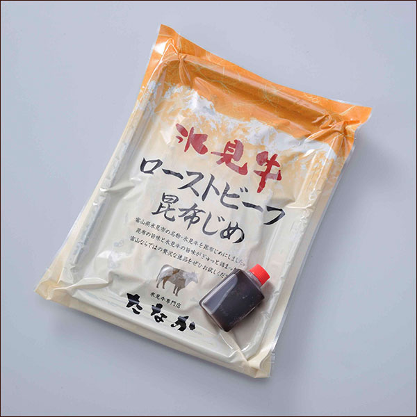 ○名称:ローストビーフ ○内容量:1パック(200g) ○原材料:氷見牛、昆布 ○配送形態:冷凍 ○保存方法:冷凍 ○賞味期限:30日 ○熨斗:可 ○名入れ:可 ○包装:可 ○手提げ:可 ○備考:冷蔵庫で解凍してお召し上り下さい ○販売者:【(有)たなか】〒935-0023 富山県氷見市朝日丘3931−1
